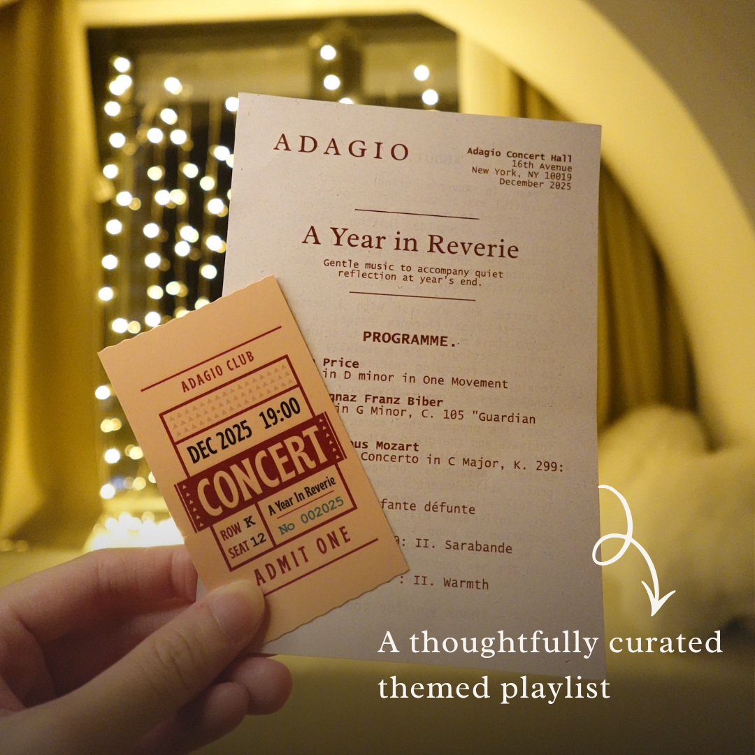 - A thoughtfully curated themed playlist (complete with a "concert" ticket + a cute mini program booklet)